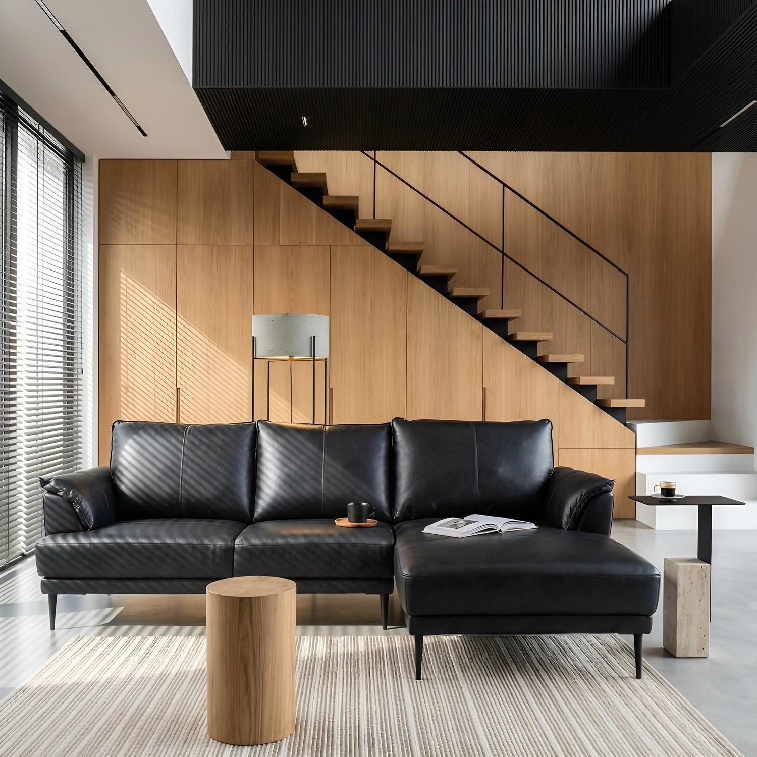L-Form Ledersofa mit Ottomane Rechts - Echtleder Schwarz