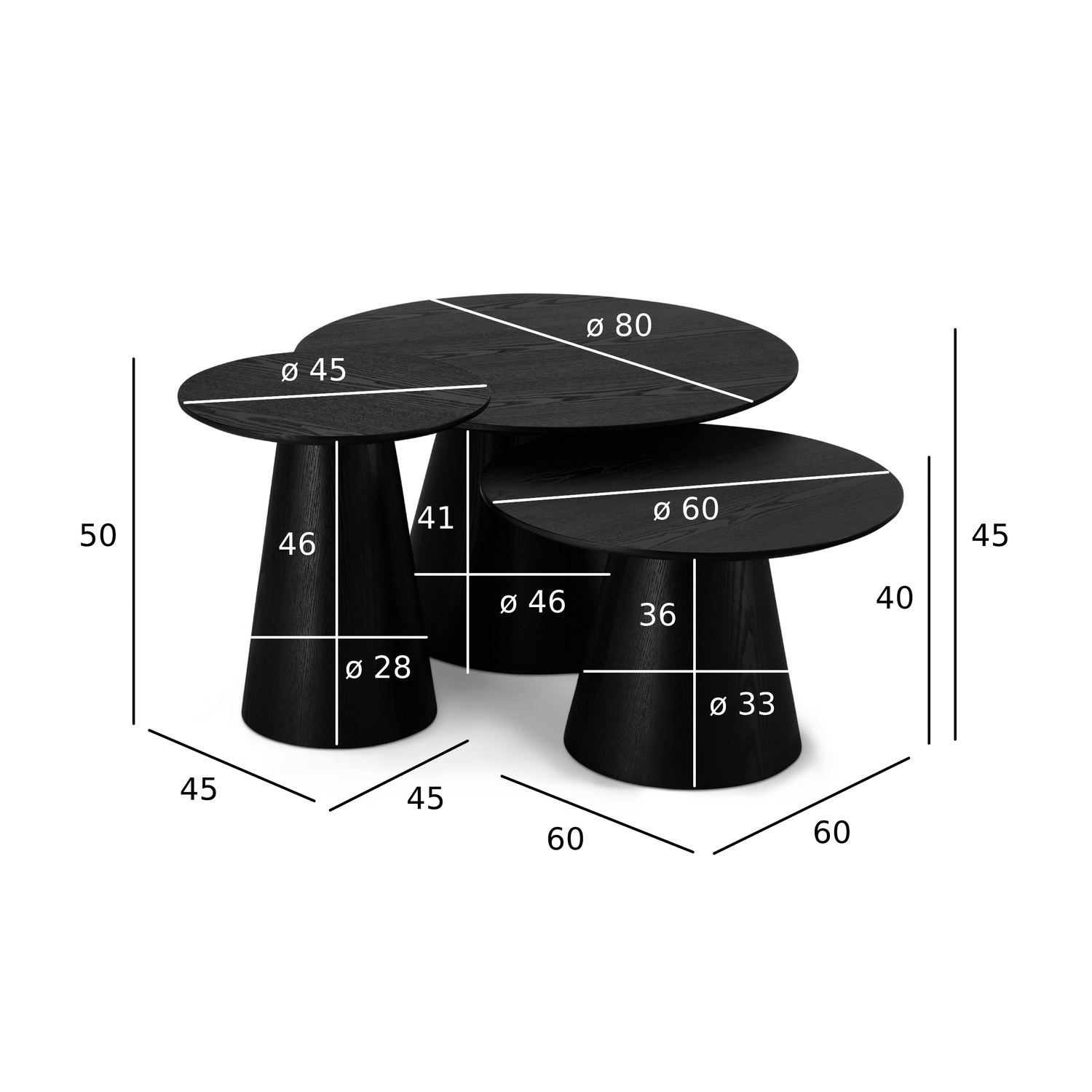 Couchtisch 3er Set ø80/60/45 cm - Eiche Schwarz